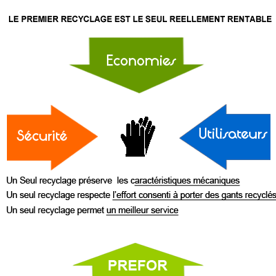 1)Proposition d'accord mutuel déterminant une quantité de gants à recycler annuellement, PREFOR s'engageant à rendre ces quantités convenues de gants (sauf bien sur ceux qui auront été déclassés et éliminés) dans un état de propreté au moins égal à ceux validé lors d'essais préalables. (essais de non contamination au contact des pièces, confort, respect dimensionnel,...). La mise en place de ce recyclage est forcement progressive : validation d’essais, atelier pilote, communication interne valorisante et mise en place de points de récupération. En respectant ces étapes, le recul actuel sur plusieurs entreprises (dont certaines sous-traitantes pour le marché de l’automobile) montre un accueil globalement favorable.